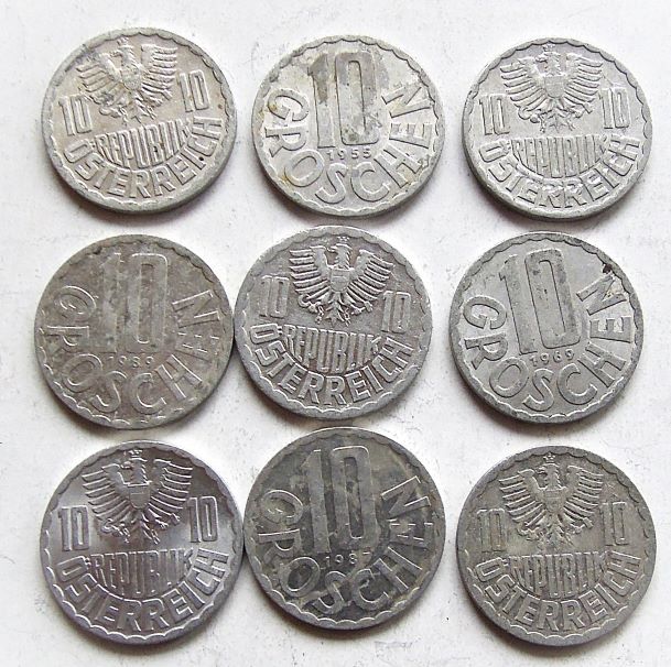 10 Groschen Austria 9pcs coin Lot. Price: 1 Euro.