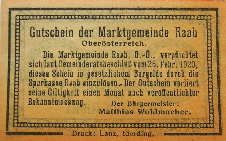 10 Heller Gutschein für der Gemeinde Raab 1920 Notgeld Unc Papiergeld Banknoten Paper money10 Heller Gutschein für der Gemeinde Raab 1920 Notgeld Unc. Preis: 1.5 Euro.
