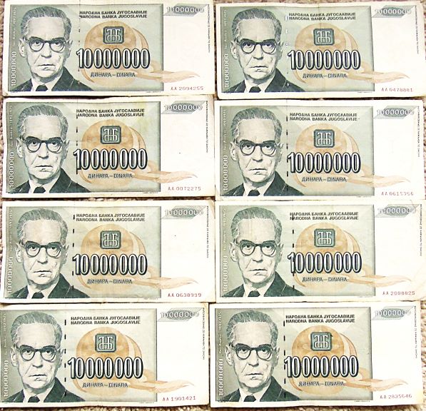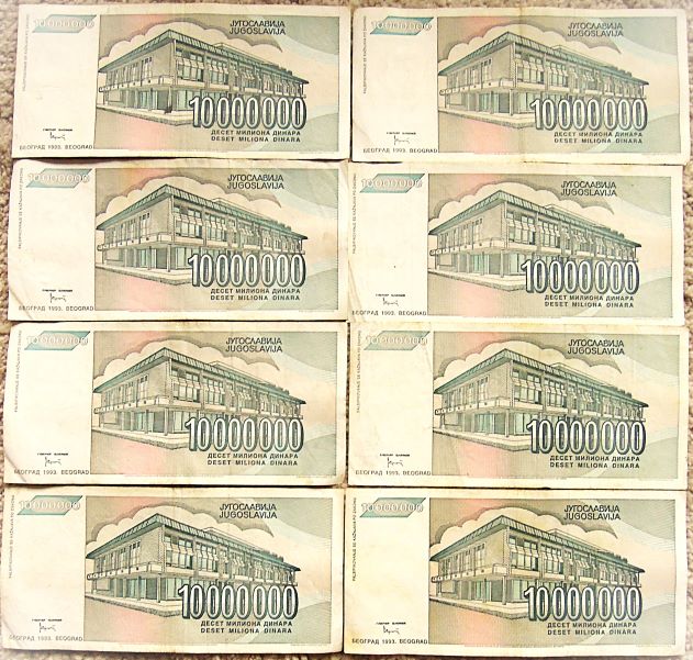 10 million Deset miliona dinar 1993 Belgrad Jugoslavia 8 pcs Lot banknote paper money Papiergeld Banknoten Paper money 10 million Deset miliona dinar 1993 Belgrad Jugoslavia 8 pcs Lot banknote paper money. Price: 5 Euro.