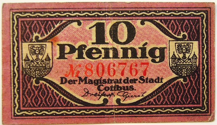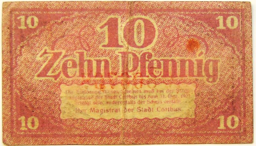 10 Pfennig Der Magistrat der Stadt Cottbus 1921 Notgeld Papiergeld Banknoten Paper money10 Pfennig Der Magistrat der Stadt Cottbus 1921 Notgeld. Price: 1 Euro.