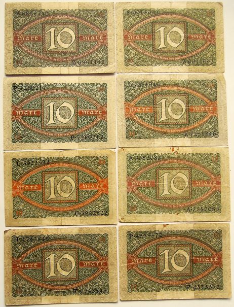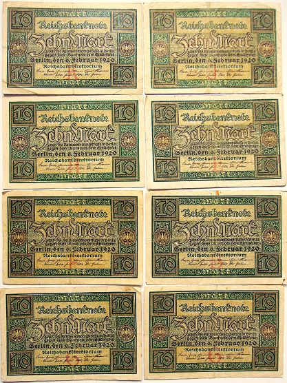 10 Zehn Mark Reichsbanknote 1920 Berlin Papiergeld Banknoten Paper money 10 Zehn Mark Reichsbanknote 1920 Berlin 8 pcs Lot. Price: 7 Euro
