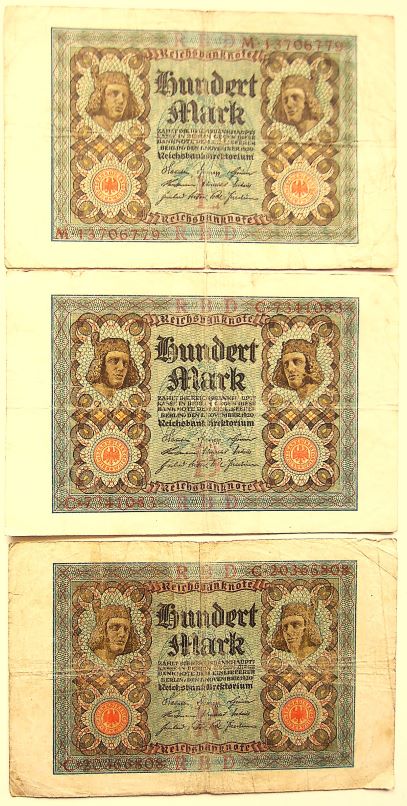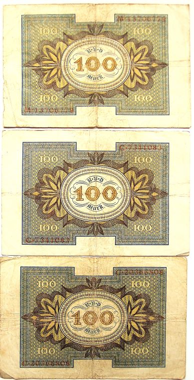 100 Hundert Mark 1920 Berlin 3 pcs Lot Banknote paper money Papiergeld Banknoten Paper money 100 Hundert Mark 1920 Berlin 3 pcs Lot Banknote paper money. Price: 5 Euro.