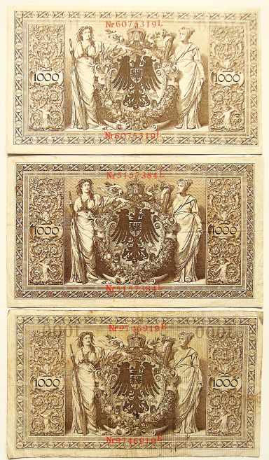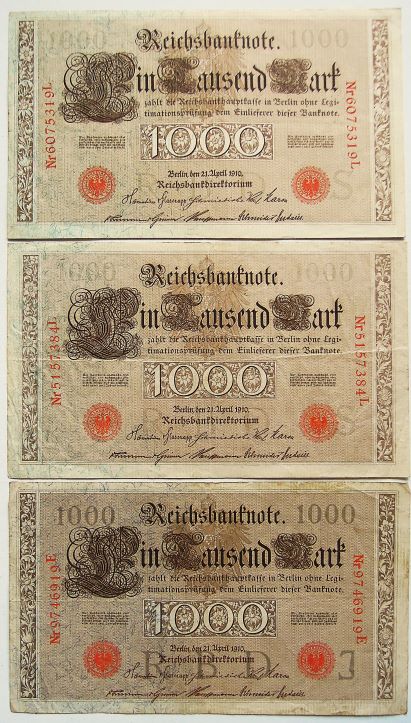 1000 Ein Tausend Mark Reichtsbanknote 1910 Lot 3 pcs Papiergeld Banknoten Paper money 1000 Ein Tausend Mark Reichtsbanknote 1910 Lot 3 pcs. Price: 5 Euro.