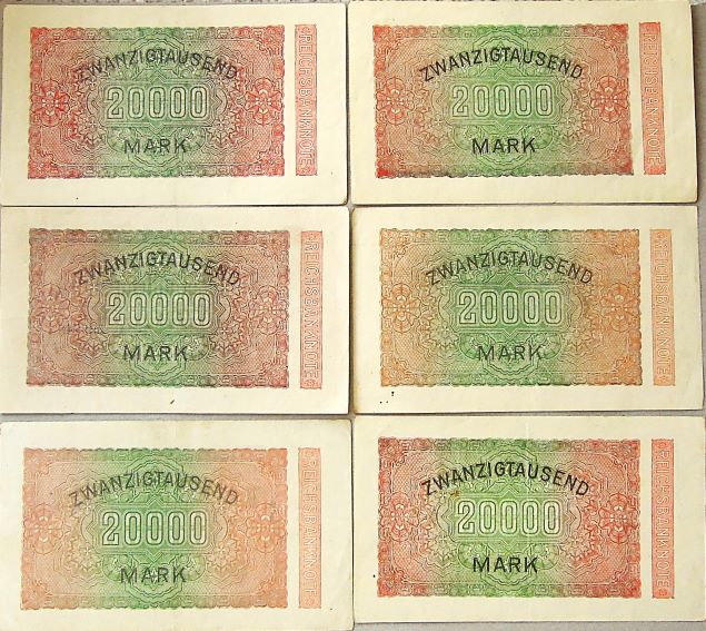 20.000 Zwanzigtausend Mark Reichsbanknote Berlin 1923 6 pcs Lot banknote paper money Papiergeld Banknoten Paper money 20.000 Zwanzigtausend Mark Reichsbanknote Berlin 1923 6 pcs Lot banknote paper money. Price: 5 Euro