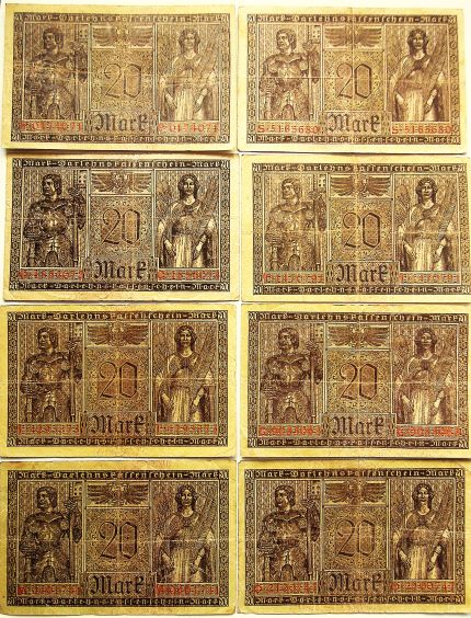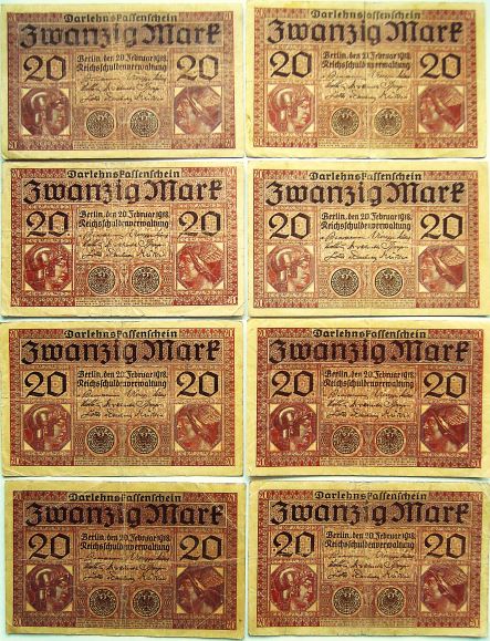 20 Zwanzig Mark Darlehnskassenschein 1918 Berlin 8 pcs LOT Papiergeld Banknoten Paper money 20 Zwanzig Mark Darlehnskassenschein 1918 Berlin 8 pcs LOT. Price: 7 Euro.