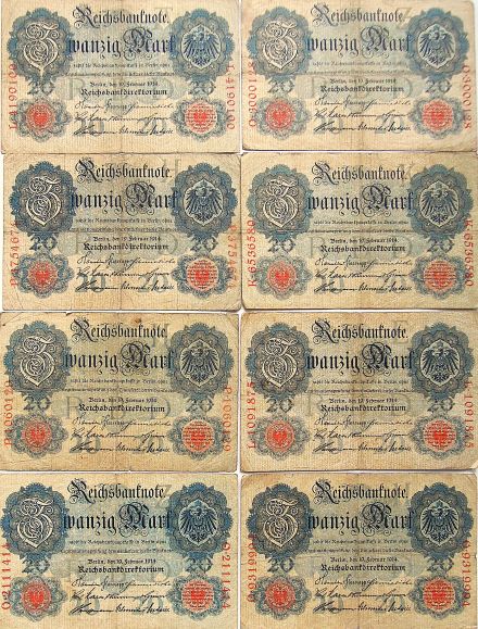 20 Zwanzig Mark Reichsbanknote Berlin 1914 Lot 8pcs Papiergeld Banknoten Paper money20 Zwanzig Mark Reichsbanknote Berlin 1914 Lot 8pcs. Price: 6 Euro.