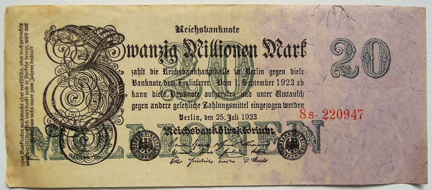 20 Zwanzig Millionen Mark Reichsbanknote Berlin 1923 Papiergeld Banknoten Paper money 20 Zwanzig Millionen Mark Reichsbanknote Berlin 1923. Price: 2 Euro