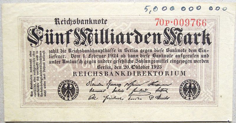 5 Fünf Milliarden Mark Reichsbanknote Berlin 1923 Banknote paper money Papiergeld Banknoten Paper money 5 Fünf Milliarden Mark Reichsbanknote Berlin 1923 Banknote paper money. Price: 12 Euro