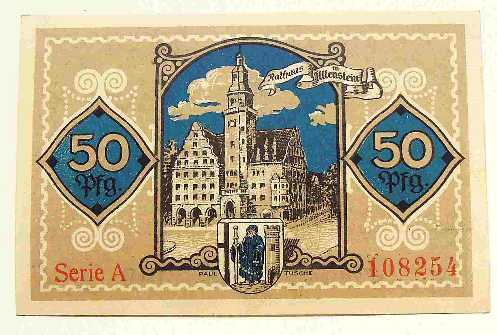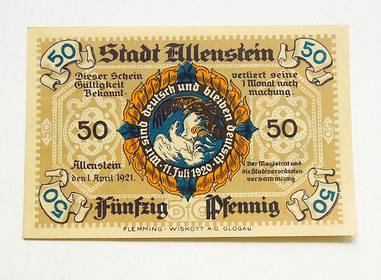 50 Fünfzig Pfennig Notgeld stadt Allenstein 1921 Notgeld50 Fünfzig Pfennig Notgeld stadt Allenstein 1921 unc. Price: 3 Euro