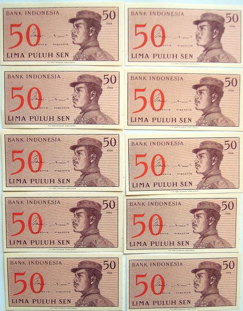 50 Lima Sen 1964 unc Indonesia banknote paper money 10 pcs Lot Papiergeld Banknoten Paper money 50 Lima Sen 1964 unc Indonesia banknote paper money 10 pcs Lot. Following serial numbers. Price: 7 Euro.