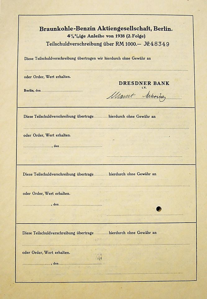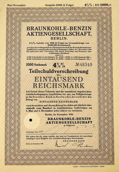 Braunkohle-Benzin Aktiengesellschaft Berlin 1938 Wertpapieren Aktie Pfandbrief Braunkohle-Benzin Aktiengesellschaft Berlin 1938. Price: 3 Euro