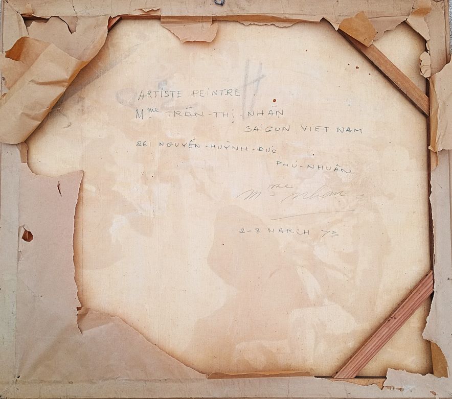 Family in Vietnam Peintre Saigon 1973 painting. Canvas. Size: 90 x 80 cm. Frame : 93 x 83 cm. Artiste Peintre Mme Tran-Thi- Nhan Saigon Viet Nam 261 Nguyen – Huyinh Duc. Phu – Nhuan. 2-8 March 73. Price: 290 Euro.