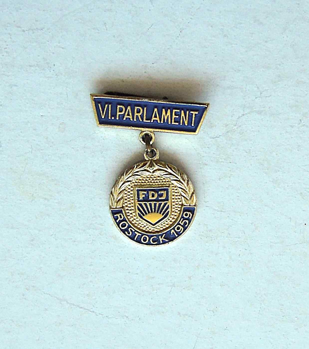 FDJ Freie Deutsche Jugend DDR VI. Parlament Rostock 1959 Abzeichen Badge pin AbzeichenFDJ Freie Deutsche Jugend DDR VI. Parlament Rostock 1959 Abzeichen. Price: 5 Euro.