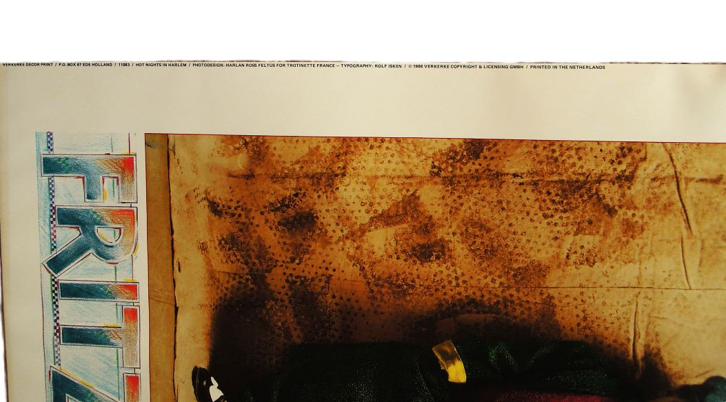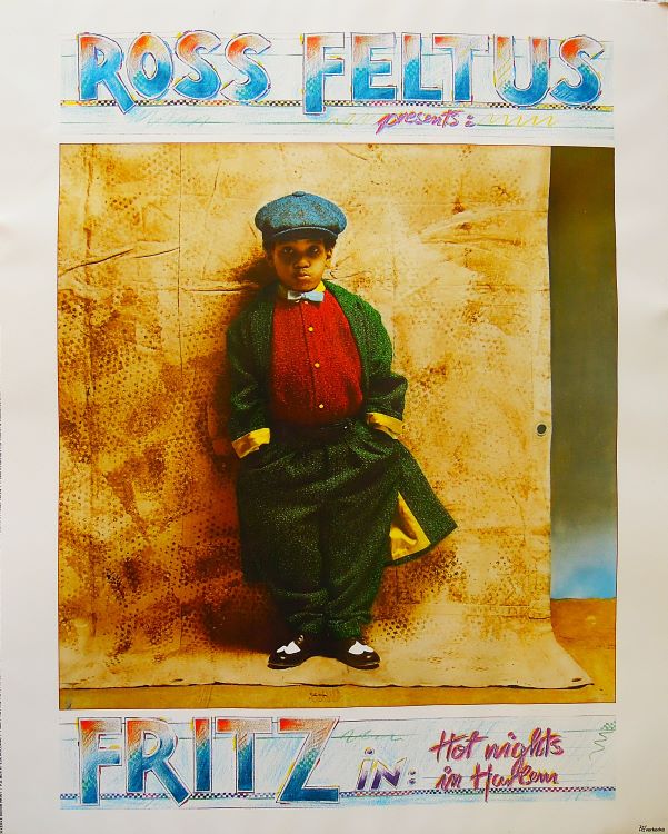 Ross Feltus presents: Fritz in Hot nights in Harlem poster. Verkerke decor print. P.O. box 67 Ede Holland. 11083. Hot nights in Harlem. Photodesign : Harlan Ross Feltus for Trotinette France. Typography : Rolf Isken. 1986. Verkere copyright & Licensing Gmbh. Printed in the Netherlands. Size: 49.5 x 40 cm. Price: 19 Euro.