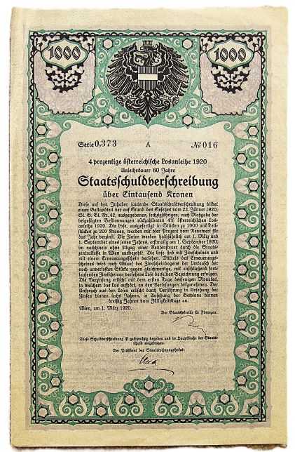Staatsschuldverschreibung 1000 Kronen 1920 Wien Wertpapieren Aktie Pfandbrief Staatsschuldverschreibung 1000 Kronen 1920 Wien. Preise: 12 Euro.